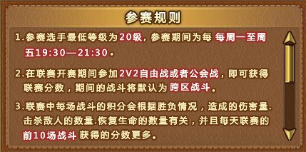 至于怎么参与联赛,非常简单!周一到周五晚上19:30-21:30,参加2V2自由战,即可获得联赛积分。需要注意的是,只有20级以上(含20级)的玩家,才能获得联赛资格,等级较低的玩家,还是先练练吧。