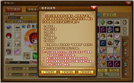 二级密码功能是为了保护玩家的虚拟财产而推出的功能,在设置了二级密码后在未解除二级密码锁定的状态下,该角色将不能进行消费、交易、删除等操作;只有在解除二级密码锁定之后才能进行相应操作。