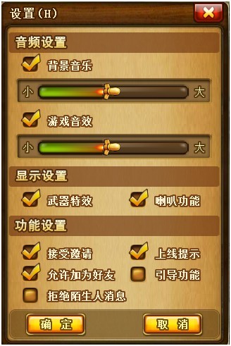 游戏音效:滑动条可调整音量大小,是否打钩可选择开启/关闭