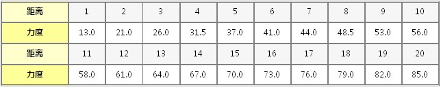 在面对对手的情况下,使用“↑ ↓”键将角度盘中显示的角度调整到65,测量自己与对手的距离。测距完毕之后参照下列公式进行发射炮弹的力度调整,下面65度不同距离使用的力度: